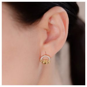€585.00 Add to cart10K Gold Claddagh Pave Set Stud Earrings are exquisitely crafted with a classic Claddagh symbol, hands, heart, and crown adorned with CZ crystals. The 10kt yellow gold setting adds sophistication and represents a rich historical heritage. Symbolizing love, friendship, and loyalty, these earrings are a cherished gift for special moments.
