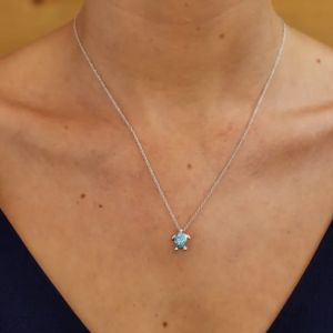 €145.00 Add to cartSterling Siver Aqua Crystal Turtle Mini Necklace is a delightful piece of jewelry. This sterling silver necklace has a teensy turtle pendant on an 20″ silver chain. This turtle has a turquoise blue shell. Aquamarine crystals sparkle from shell scutes. In contrast, its snout and limbs are in plain silver. The turtle is a symbol of long life, wisdom and resilience. Turquoise blue color links to calm oceans and emotions. Likewise, aquamarine crystals too enhance the sense of serenity. This necklace looks good worn with other necklaces of varying lengths in a layered style. Interestingly, many pieces from our range go really well with this one. We recommend stocking this necklace and many others from our portfolio to encourage your buyers to buy many pieces.