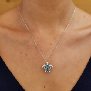 €155.00 Add to cartPresenting the Medium Blue Turtle Pendant Necklace, an elegant accessory for casual charm. Made from Sterling silver, it features a mid-sized turtle pendant with a turquoise shell adorned by seven ocean aquamarine crystals, paired with a slim cable chain. Symbolizing wisdom and protection, the turtle merges with aqua crystals’ clarity and peace. Elevate style and meaning effortlessly.