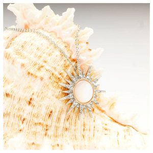 €180.00 Add to cartDiscover radiance with the Sterling Silver Mother of Pearl Sun Pendant featuring White Crystals and Rose Gold accents from Ocean’s ‘Drops of Joy’ collection. Crafted with precision, the pendant showcases a mother-of-pearl sun encircled by rose gold, adorned with shimmering white crystals on the sun’s rays. The uppermost ray cleverly serves as a concealed bail for the delicate chain. An ideal gift for someone who illuminates your life. Also available in Gold Vermeil option.
