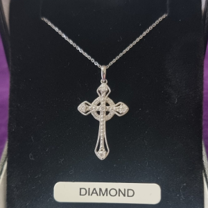 €850.00 Add to cartCeltic cross pendant set in 9ct white gold with .21ct of diamond and an 18 inch/46cm chain.