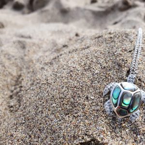€185.00 Add to cartThis exquisite sterling silver turtle pendant is adorned with shimmering white Swarovski crystals and vibrant abalone. It hangs elegantly on an 18-inch (46 cm) sterling silver chain, combining natural beauty and sophisticated sparkle. Perfect for adding a touch of oceanic charm to any outfit.