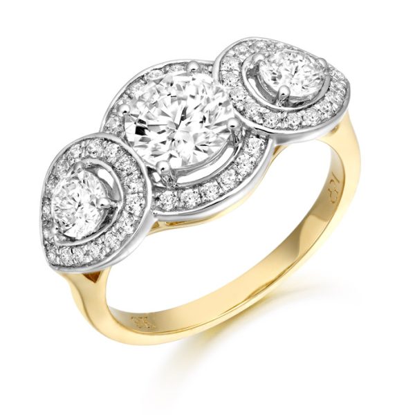 Featuring a three stone setting of the most sparkling Cubic Zirconia, all three Brilliant cut stones are surrounded by a glittering halo, as well as more small brilliant cut CZ that fill the Ring in a beautiful in Micropave stone setting, to ensure the most breath-taking sparkle in every light.