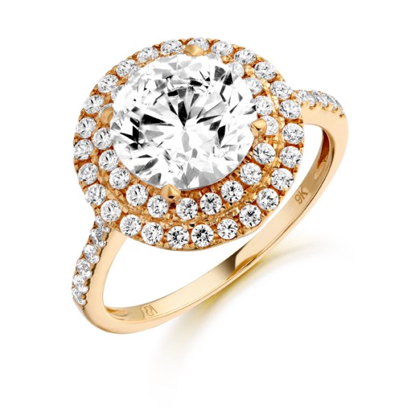This Gold Ring is Set with a round brilliant cut cubic zirconia solitaire in the centre and encrusted with glittering two rows of Micro Pave CZ stones which really increases the impact.