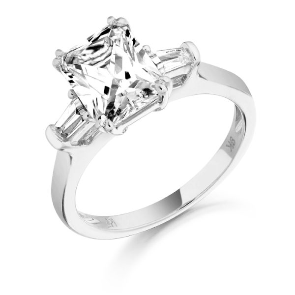 Ladies 9ct White Gold ring with cubic zirconia. Emerald Cut cubic zirconia centre stone shimmer in this 9K White Gold band giving this Ring a classic look that evokes a sense of romance. Whether it is an anniversary or the beginning of your lives together, celebrate with the gift of this CZ Ring.