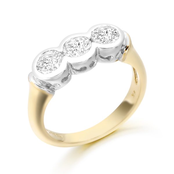 9ct Gold Three Stone CZ Ring. Romantic, timeless and Glamorous and very feminine, this beautiful three stone 9ct Two Tone Gold CZ Ring will provide the wow-factor in any look. Inspired by the fashionable vintage styles that are a favourite of celebrities this season, this stunning Gold Ring features all Three Bezel set Brilliant cut stones for extra sparkle and sophistication.