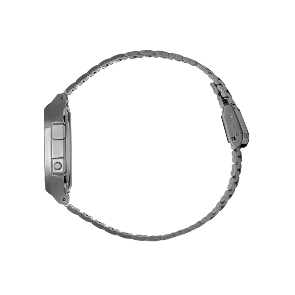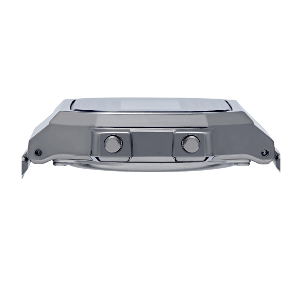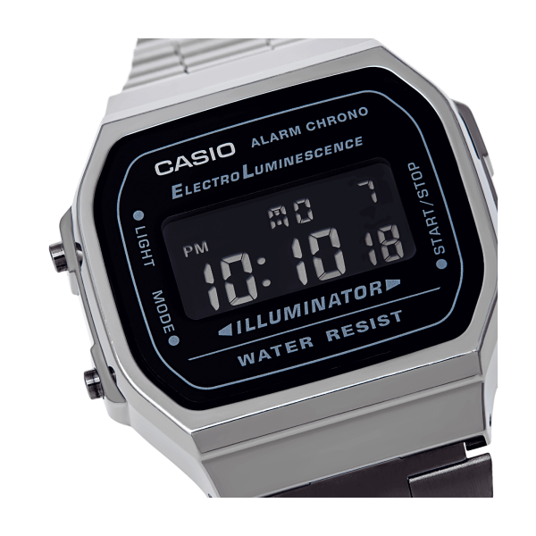 A classic CASIO design, part of the Vintage Retro Collection. This timepiece features a digital display, an Illuminator, daily alarm, and stopwatch. Resistant to minor splashing.