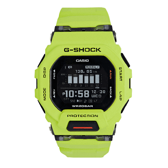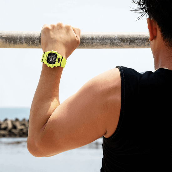Get in on the thinnest G-SQUAD yet. Side slits in the bezel allow the color of the inner case to peek through, highlighting just how slim this watch is. The light button is positioned on the case front for handy access to ensure an easy read during night workouts. Access your smartphone GPS via Bluetooth® for precision accelerometer measurement. All the info you need is at your fingertips — distance, speed, and pace, as well as auto lap readings to keep track of running times for set distances. The display includes calories burned, a step tracker, interval timer, and lap timer to keep your daily exercise on track. Also use the app to check life logs and activity history from your watch. With extra adjustment holes in the soft urethane band for a quality, precision fit, you’re set to enjoy full-on function and complete comfort. Available in lime green, black, or navy blue.