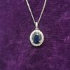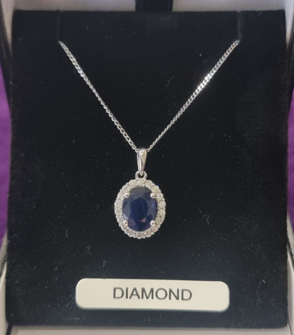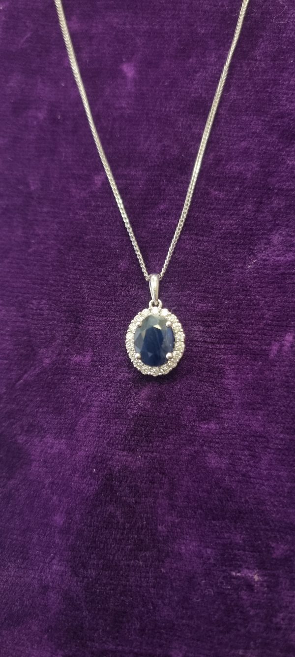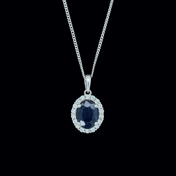 This stunning 9ct white gold pendant features a 2.5-carat oval-shaped blue sapphire, surrounded by a cluster of 0.20 carats of brilliant-cut diamonds. The deep blue sapphire, the September birthstone, symbolizes wisdom and prosperity. This elegant piece is suspended on an 18-inch/46cm white gold chain, making it a timeless accessory for any occasion. Its sophisticated design and exquisite gemstones make it a perfect gift or personal treasure.