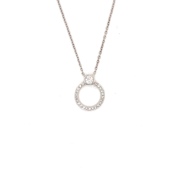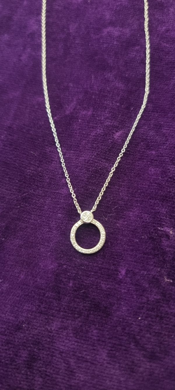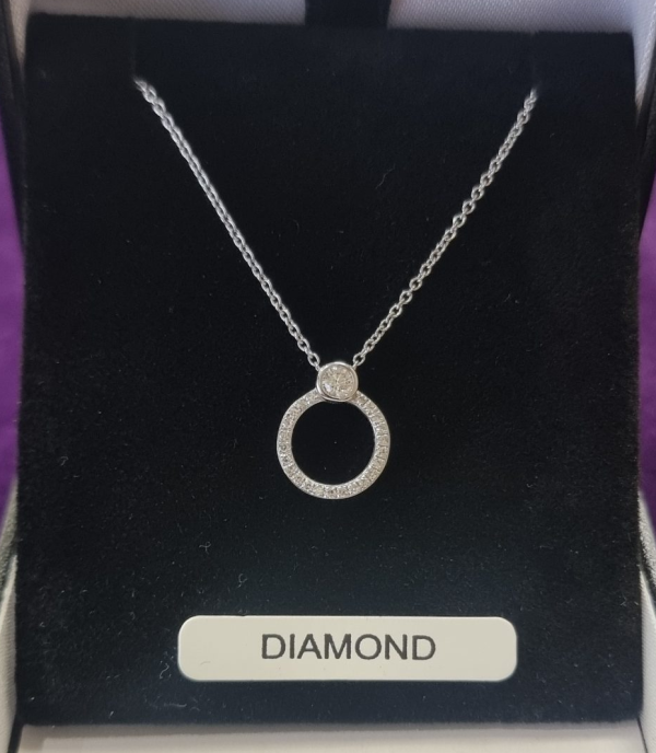 This delicate necklace features a pendant set with .15 carats of sparkling diamonds, elegantly crafted in 9ct white gold. Suspended on an 18 inch (46 cm) chain, the design exudes subtle sophistication. Perfect for adding a touch of glamour to any outfit, it blends timeless elegance with modern charm.