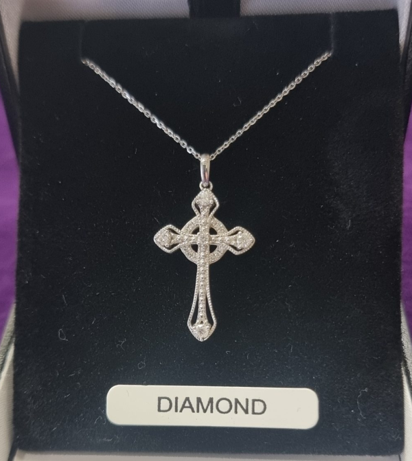 Celtic cross pendant set in 9ct white gold with .21ct of diamond and an 18 inch/46cm chain.