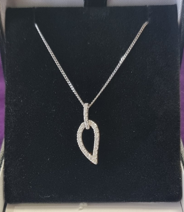 This exquisite 9ct white gold pendant features a delicate leaf shape adorned with 0.29 carats of brilliant-cut diamonds. Each stone adds a touch of sparkle and elegance, making it a timeless accessory. The pendant hangs gracefully on an 18″/46cm white gold chain, perfect for any occasion.