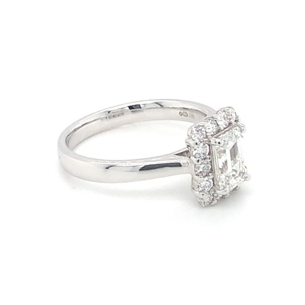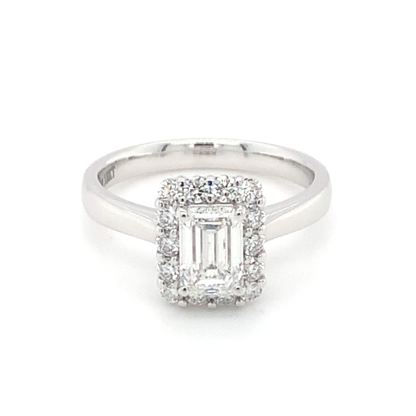 Elegant and timeless, this 18ct white gold engagement ring showcases a dazzling 1.20 carat lab-grown emerald cut diamond, exuding brilliance and sophistication. Surrounding it, a halo of 20 points of brilliant cut diamonds adds sparkle and allure, symbolizing eternal love and commitment in every facet.