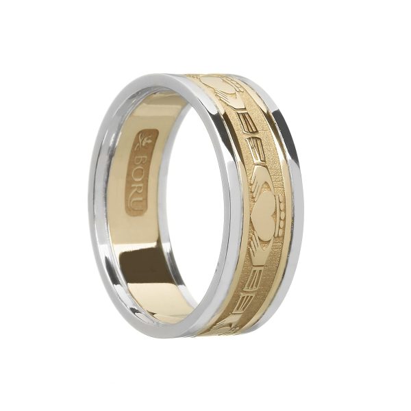 This Claddagh band has five Claddagh symbols running around the central band in yellow gold with white gold trims.