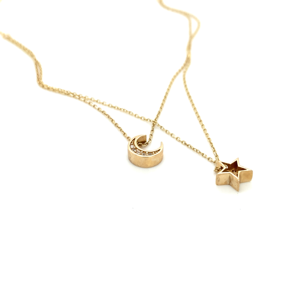 The 9ct gold moon and star neck chain, set with sparkling cubic zirconia, embodies celestial charm. With delicate craftsmanship, it evokes the enchanting beauty of the night sky. This stunning piece adds a touch of celestial elegance to any attire, making it a radiant choice for celestial enthusiasts and jewelry aficionados.