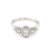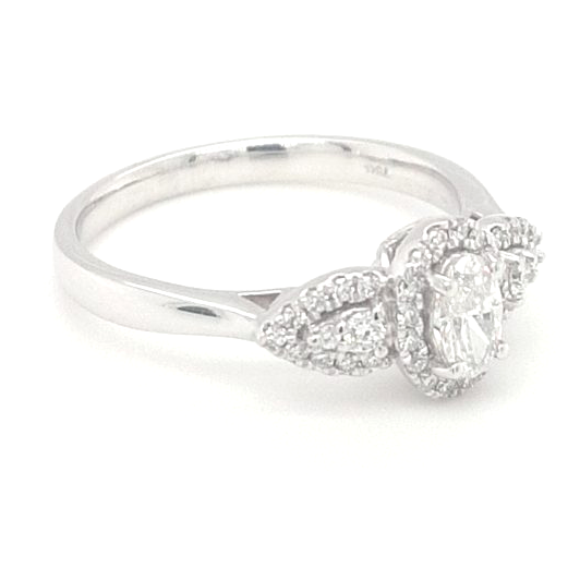 A .30 carat oval cut centre diamond set in a halo of of brilliant cut diamonds. The total diamond weight in this engagement ring is .52 carat and is made with 18ct white gold. It is also available to order in yellow gold and platinum.