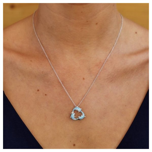 Presenting the Aqua Crystals Three Dolphins Necklace, intricately crafted from Sterling silver. The pendant showcases turquoise-accented dolphins with silver fins, adorned by aquamarine crystals. A discreet fin bail facilitates the slender silver chain. Dolphins symbolize protection, playfulness, and wisdom, while turquoise and crystals enhance serenity.