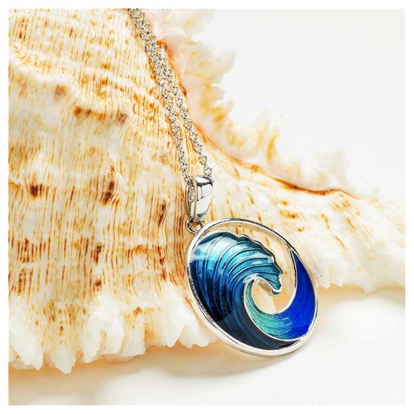 The Sterling Silver Blue Enamel and Wave Necklace is a breathtaking accessory. Vivid and vibrant, its circular pendant features an ocean wave pattern with blue enamel details. The crest and the curl of this wave are captured beautifully in various shades of blue. The accompanying chain is plain silver. An ocean wave symbolizes growth, renewal, and transformation, while the circle signifies endless connections. Shades of blue link to the ocean and the sky. This necklace will catch the fancy of women buyers who love surfing, swimming, and sailing.
