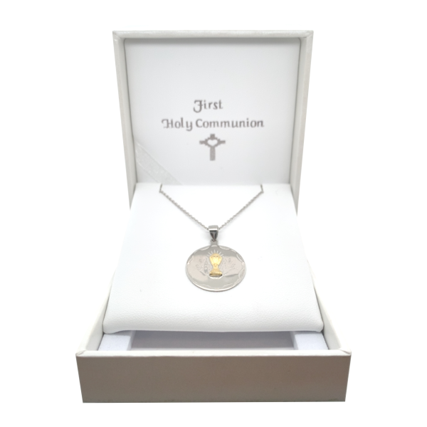 This elegant communion medal features a round sterling silver disc, beautifully accented with gold plating.  It comes on a delicate 16-inch silver chain, perfectly suited for young wearers. Presented in a commemorative box, it makes a meaningful keepsake for this special spiritual milestone.