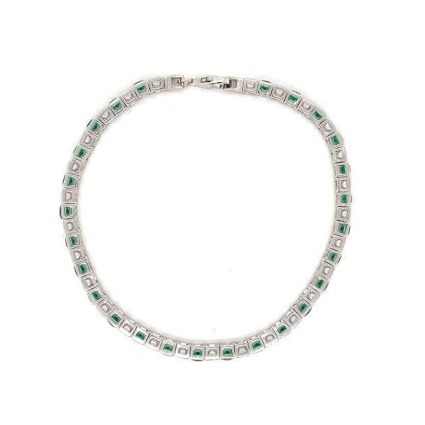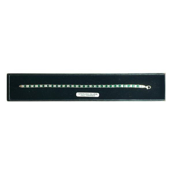 Sterling silver tennis style bracelet with green and white stones, 7.5 inches in length.