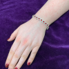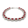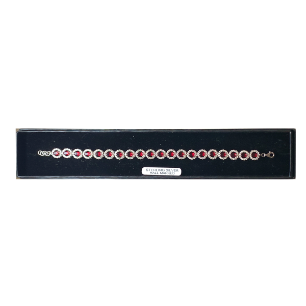 This sterling silver bracelet showcases round-shaped clusters of red and white stones, creating a vibrant and eye-catching design. The bold contrast between the stones adds a touch of glamour and sophistication. Ideal for elevating any outfit, it’s perfect for both special occasions and adding a pop of color to everyday wear.