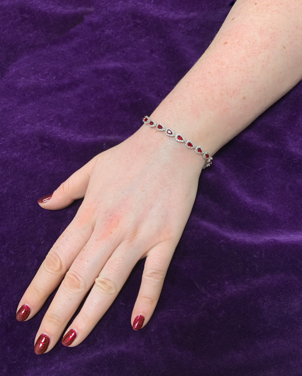 Sterling silver pear shape cluster bracelet with red and white stones, 7.5 inches in length.