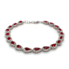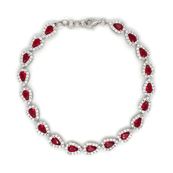 This sterling silver bracelet features pear-shaped clusters adorned with striking red and white stones, creating a visually captivating design. The elegant arrangement of the stones adds depth and sophistication, making it a versatile accessory. Ideal for both formal events and daily wear, it adds a refined, colorful touch to any outfit.