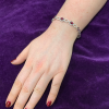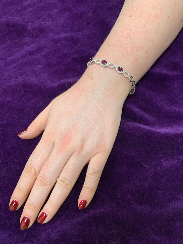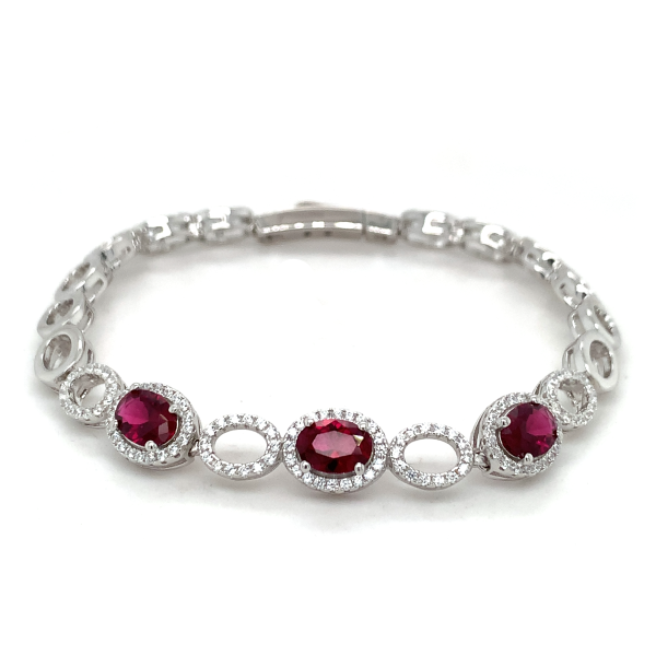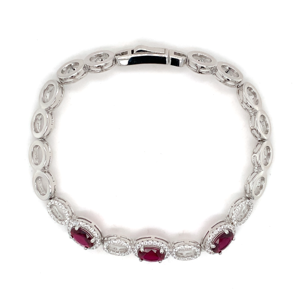 This striking sterling silver bracelet features a beautiful arrangement of white and red stones, creating a bold and elegant contrast. The vibrant red stones add a pop of color, while the white stones offer a classic sparkle. Perfect for special occasions, it adds a touch of glamour to any outfit.
