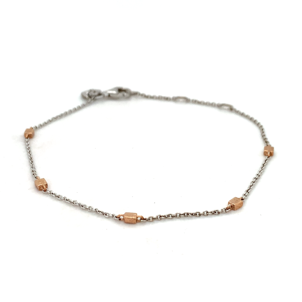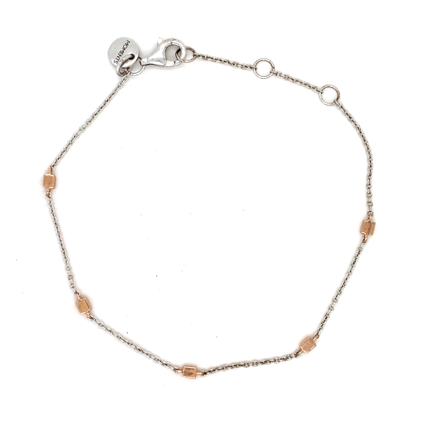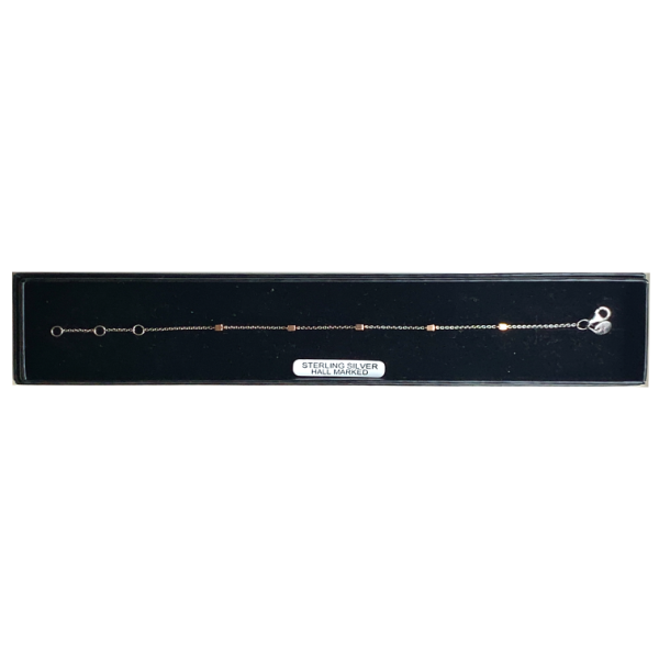 This dainty sterling silver bracelet features charming rose gold-plated beads, offering a soft and feminine touch. The contrast between the silver and warm rose gold creates a delicate, modern look. Perfect for layering or wearing alone, it’s an elegant accessory that adds subtle sophistication to everyday outfits.