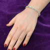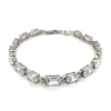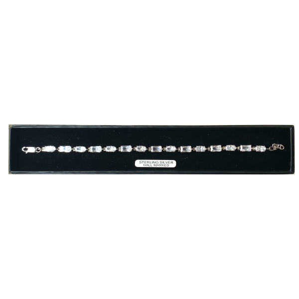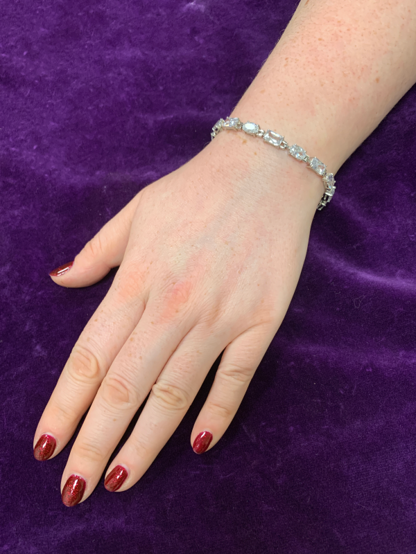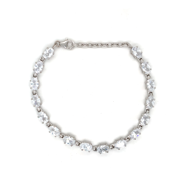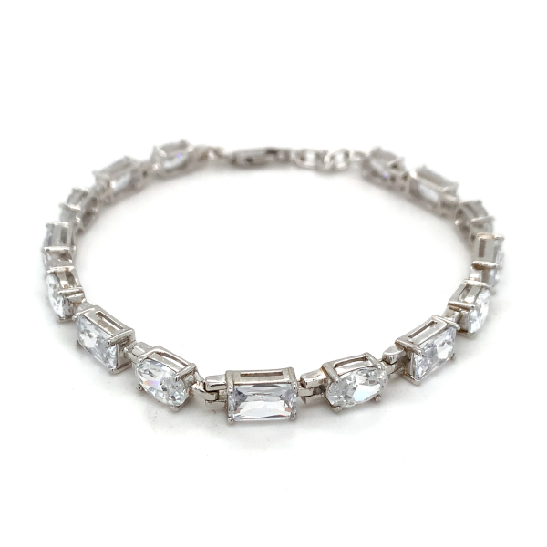 Sterling silver tennis style bracelet with oval and radiant cut shaped stones, 7.5 inches in length.