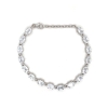This sterling silver tennis bracelet features a stunning mix of oval and radiant-cut stones, elegantly arranged to create a dazzling effect. The combination of shapes enhances the bracelet’s brilliance and sophistication, making it a perfect accessory for both special events and everyday wear. Its timeless design adds a touch of luxury to any outfit.