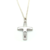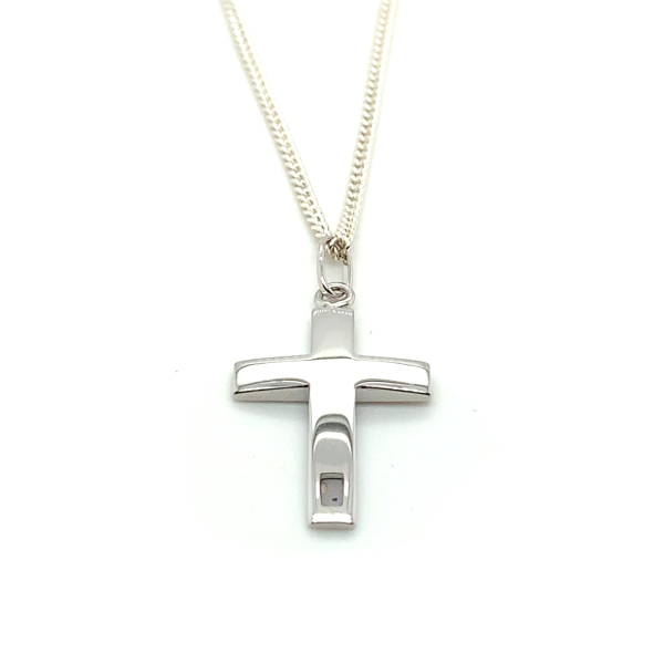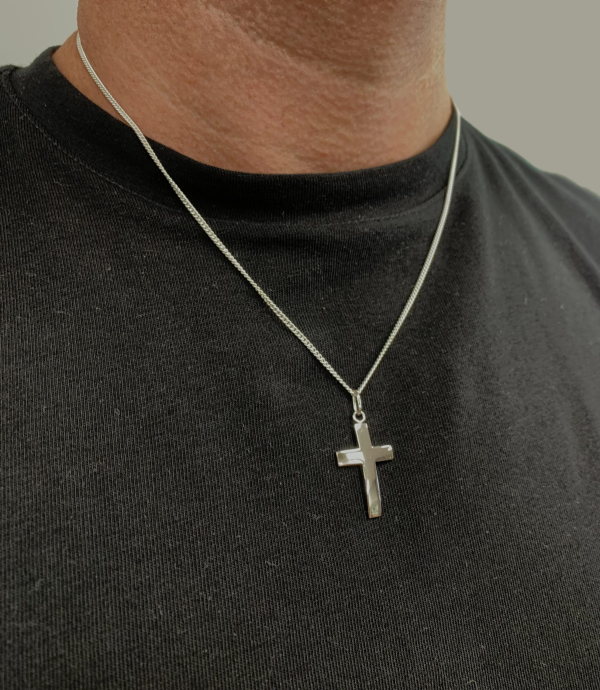 A simple sterling silver cross and chain. The cross length is 27mm/1″ and 16.5mm/1/2″ wide.