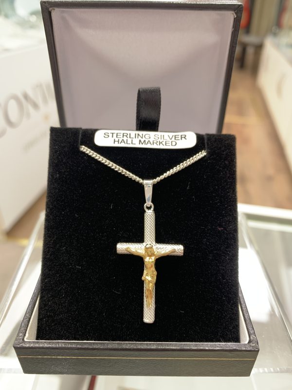 This elegant crucifix is crafted in sterling silver and beautifully accented with a gold-plated figure of Christ, creating a striking contrast that highlights its sacred detail. A timeless piece of devotion, it serves as both a symbol of faith and a meaningful accessory for everyday wear. The crucifix is available with two chain options, offering flexibility to suit personal preference. Choose between a 20-inch chain (approximately 50 cm) or a 22-inch chain (approximately 55 cm), both designed for comfort and durability. A perfect gift for a loved one or a cherished addition to your own jewellery collection.