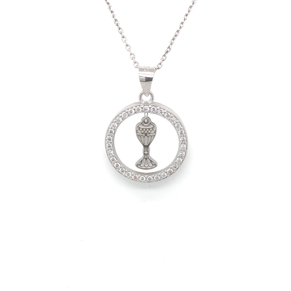 Sterling silver Communion Medal is set with Cubic Zirconia and has a hanging silver chalice, comes complete with 18 inch chain and box as seen in our sample image.