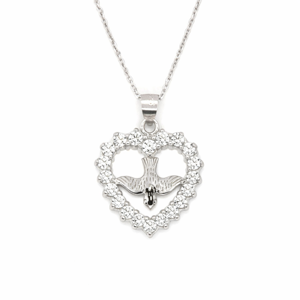 This fabulous cubic zirconia Heart shaped pendant with Dove at the center is an ideal gift for any child making their confirmation.