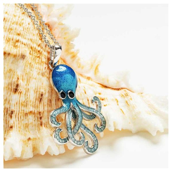 The Sterling Silver Sapphire Enamel and CZ Octopus Necklace is a playful jewelry piece. This necklace has an octopus pendant on a silver chain. As all its eight arms are curving in different ways, the octopus seems to be dancing. Its rounded head has deep blue enamel work that lightens towards the arms. Two sapphire blue CZ stones mark the eyes. Lighter colored CZ stones embellish the arms. The octopus symbolizes flexibility, mystique, and intelligence. Blue sapphire CZ stones link to deep oceans and psychic abilities. Keep this charming necklace in your store for buyers who want their jewelry to have a touch of quirkiness.