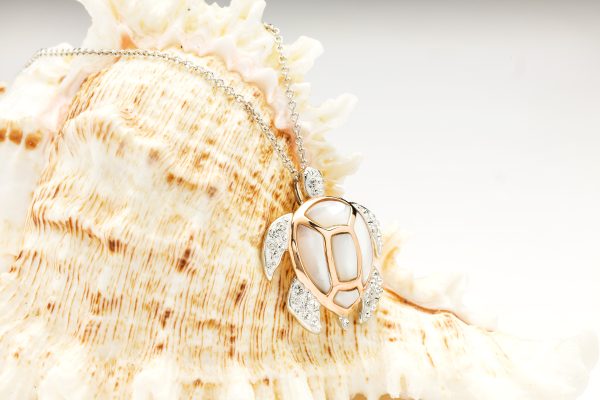 This stunning sterling silver turtle pendant features elegant rose gold accents, sparkling Swarovski crystals, and lustrous mother of pearl. Hanging on an 18-inch (46 cm) chain, it blends timeless elegance with a touch of modern flair, making it a perfect accessory to elevate any ensemble.